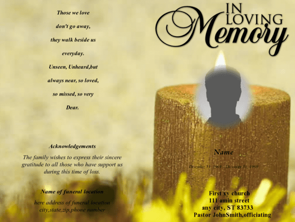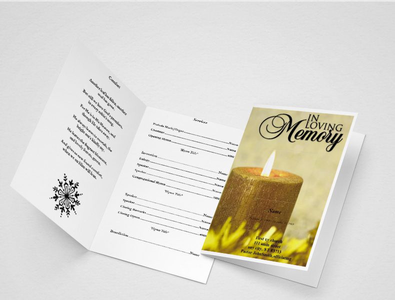 Here is a stunning perspective of the Funeral Program Template that portrays the religious topic of an entombment benefit program. The format is covering a region of 8.5″ x 11″.The yellow light of the flame symbolizes the confidence that you are communicating simultaneously. A lit flame can interface the physical world with the profound domain.
