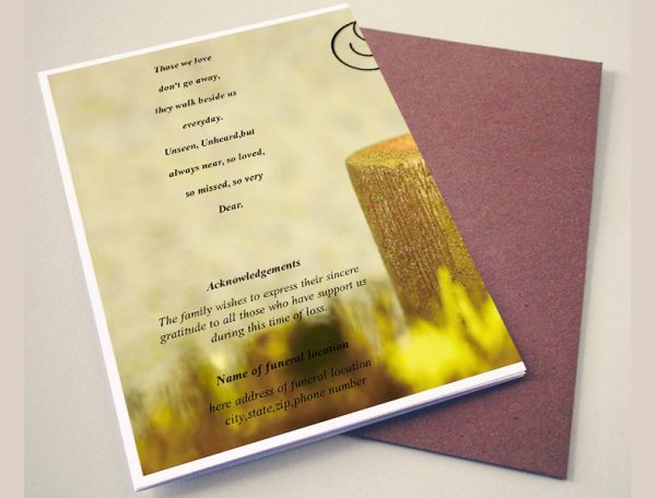 Use free funeral poems to create a good funeral program card. Funeral Card Templates are easy to customize using online drag-drop-based software where you can add unlimited text and images. You can choose from free funeral program background images, funeral sentiments, and funeral ornaments to create a beautiful funeral program using a funeral card template.