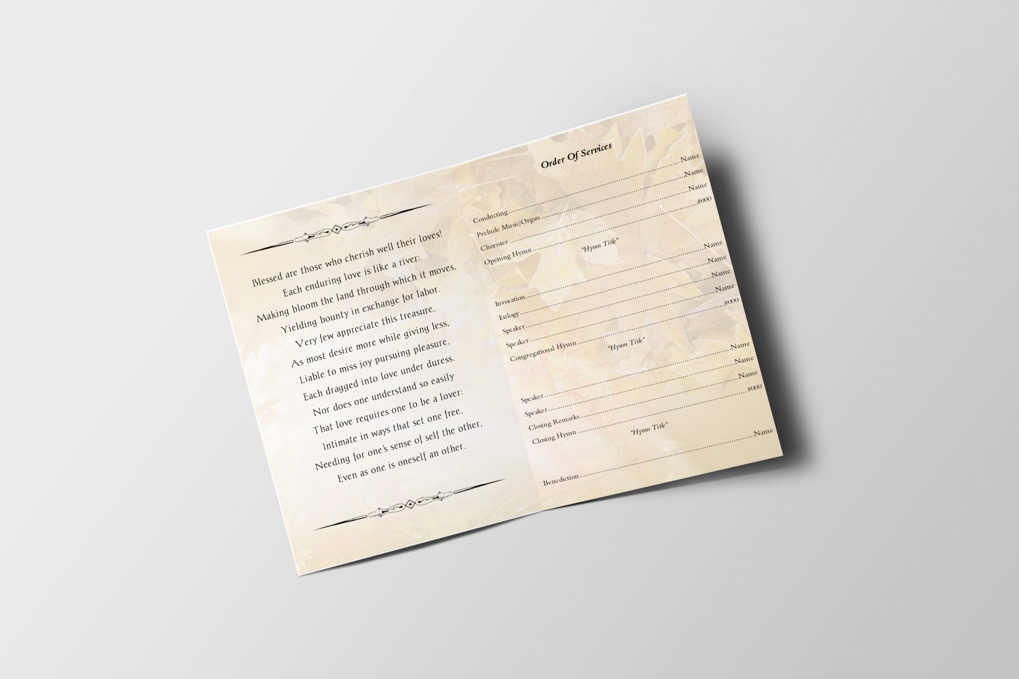 Searching for a Colored Autumn Funeral Program Template that is easy to print and amass and that has a cutting-edge look? This Colored Autumn Funeral Program Template Letter Size is the Perfect decision that is having a measure of 8.5”x 11”.
