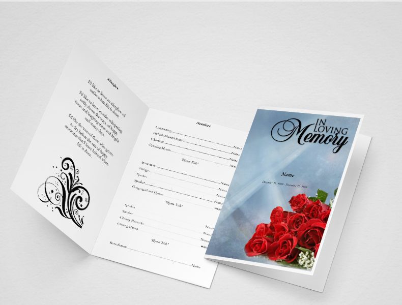 There are actually many other designs and sizes of programs that a funeral director will help you with. You can also shop online with a variety of sites that specialize in helping you to design programs and will have many funeral templates for programs available for you to choose from.