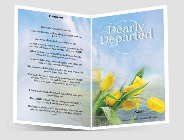 The notable perspective of this given Footprint Funeral Program Template is looking extremely beautiful and respectable that is holding a size of 8.5″ x 5.5″.The shading that it is having out of sight is “adding the quills to one’s top”. At the base right of this layout, beautiful bunch of yellow roses can be seen that are known for having their own particular dialect. Yellow color of flowers delineates a sensitive signal of communicating a sympathy.