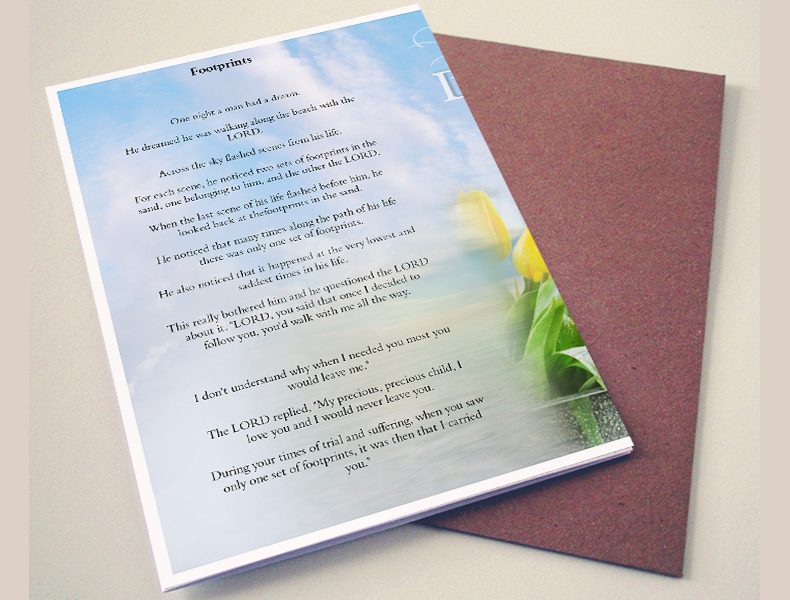 There are actually many other designs and sizes of programs that a funeral director will help you with. You can also shop online with a variety of sites that specialize in helping you to design programs and will have many funeral templates for programs available for you to choose from.