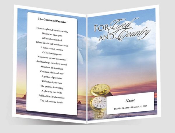 Here is a very beautiful view of the Garden of Promise Funeral Program Template possessing a measurement of 8.5” x 11”. The Progressive change of two hues that can be seen underneath the mists looks cute demonstrating the sentiment dejection on death of friends and family.