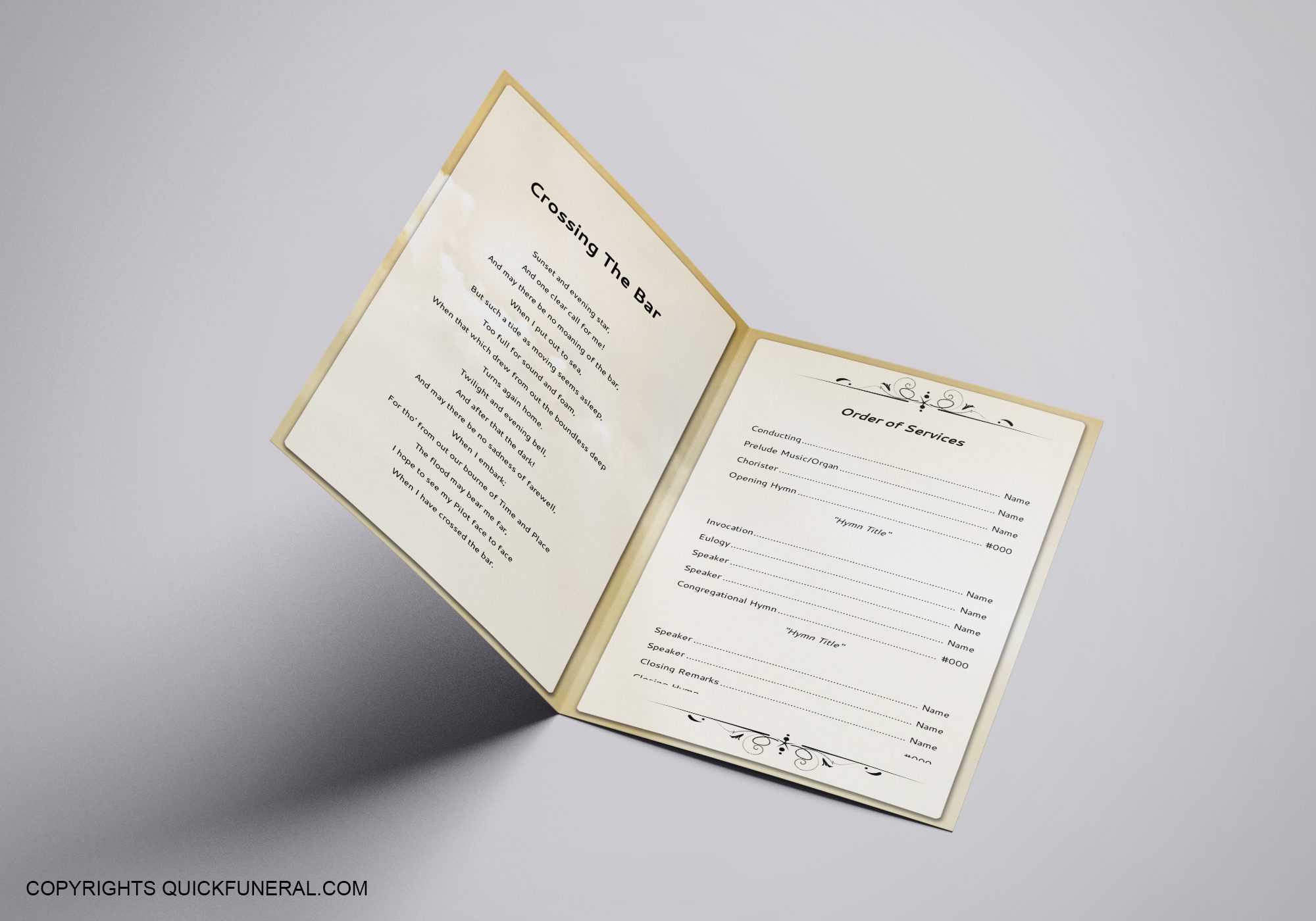 Use free funeral poems to create a good funeral program card. Funeral Card Templates are easy to customize using online drag-drop-based software where you can add unlimited text and images. You can choose from free funeral program background images, funeral sentiments, and funeral ornaments to create a beautiful funeral program using a funeral card template.
