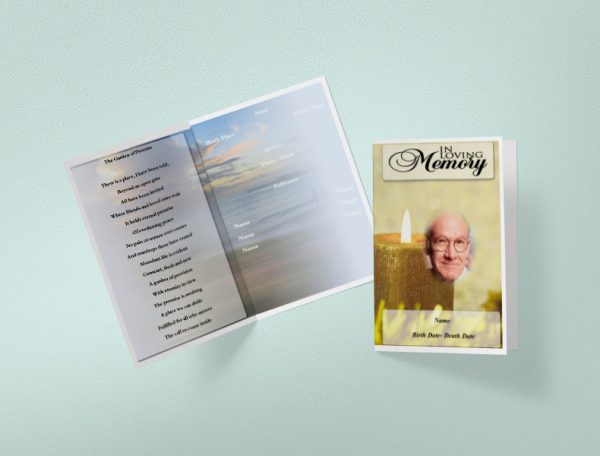 Searching for a religious Funeral program template that is easy to print and amass and that has a cutting edge look? This Yellow Candle Funeral Program Template is Perfect decision that is having a measure of 8.5”x 11”.The Yellow shade of the light has an exceptionally compelling mending power, gives us a sentiment quality, additionally go about as a guide in beating psychological barriers. The candles are required at funerals to control the withdrew through the dimness to the unceasing light that was sitting tight for them.